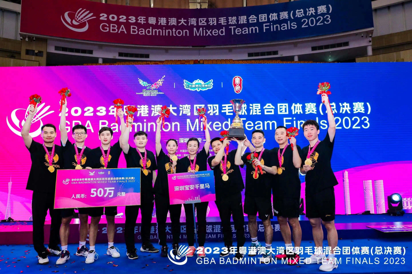 11月11日,2023年粵港澳大灣區羽毛球混合團體賽(總決賽)在寶安體育館開拍。共有來自香港、澳門、廣州、深圳、珠海、佛山、東莞、中山、惠州、江門、肇慶等11個大灣區城市羽協組隊參賽,今年賽事更是擴大“朋友圈”,力邀馬來西亞、泰國羽毛球協會精英選手參賽,16支精英隊伍148 名高水平選手齊聚深圳。本次比賽由中國羽毛球協會、廣東省體育局指導、廣東省羽毛球協會、深圳市文化廣電旅游體育局、寶安區人民政府共同主辦,寶安區文化廣電旅游體育局承辦。 深圳寶安千里馬隊代表寶安區人民政府參賽,在淘汰賽階段和1/4決賽上分別戰勝了廣東省羽毛球協會、香港之星羽毛球會,最終以2:0戰勝馬來西亞LCBA隊問鼎灣區之巔,奪得2023年粵港澳大灣區羽毛球混合團體賽(總決賽)總冠軍。                                                       比賽現場                                                          比賽現場 總決賽以打造灣區國際性、區域性品牌賽事為目標,全力打造高水平、高質量、高品質的灣區運動新品牌。今年賽事延續2022年推出“百萬獎金”,冠、亞、季軍獎勵分別高達50萬、30萬、10萬獎勵。總冠軍得主、深圳寶安千里馬隊路源表示,本次賽事競賽水平很高,隊伍在頂住了馬來西亞多輪強勢進攻,為深圳、為寶安將冠軍寶座留在深圳。