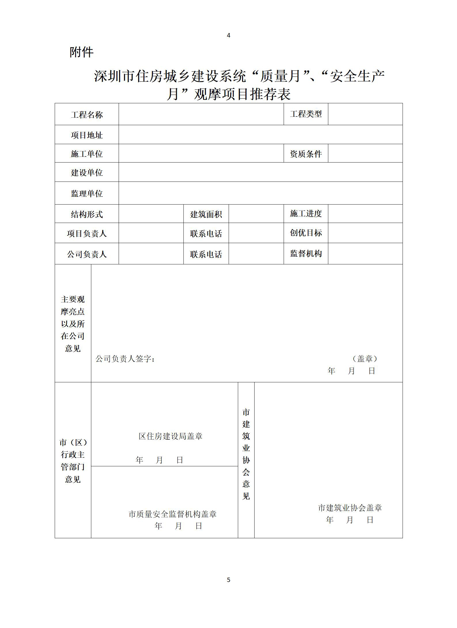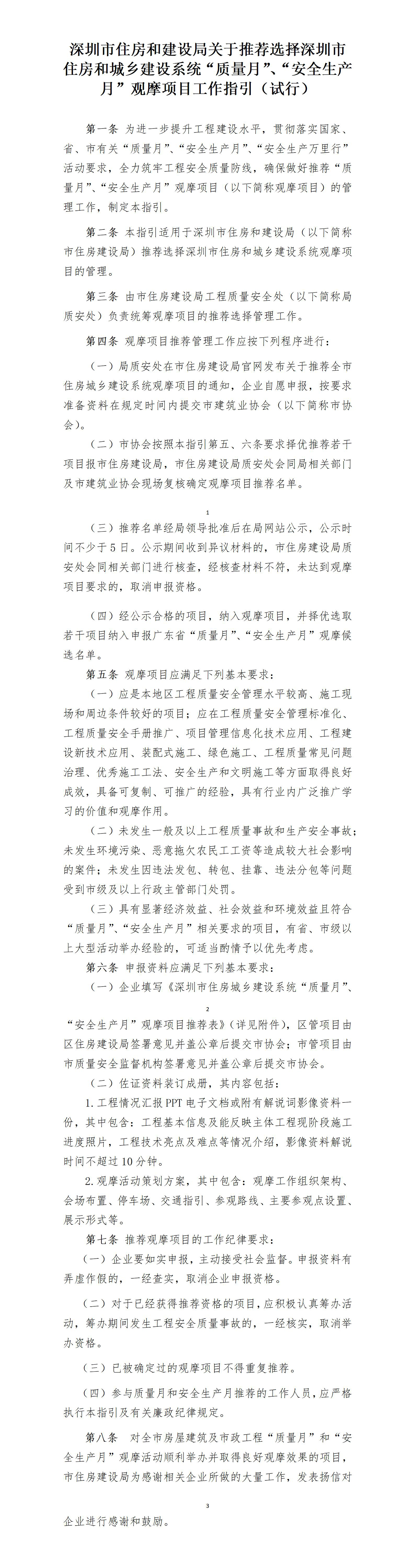 為進一步提升工程建設水平,貫徹落實國家、省、市有關“質(zhì)量月”“安全生產(chǎn)月”“安全生產(chǎn)萬里行”活動要求,全力筑牢工程安全質(zhì)量防線,規(guī)范深圳市住房和城鄉(xiāng)建設系統(tǒng)推薦“質(zhì)量月”“安全生產(chǎn)月”觀摩項目的管理工作。經(jīng)研究,我局制定了《深圳市住房和建設局關于推薦住房和城鄉(xiāng)建設系統(tǒng)“質(zhì)量月”“安全生產(chǎn)月”觀摩項目工作指引(試行)》。現(xiàn)予以印發(fā),請認真貫徹執(zhí)行。