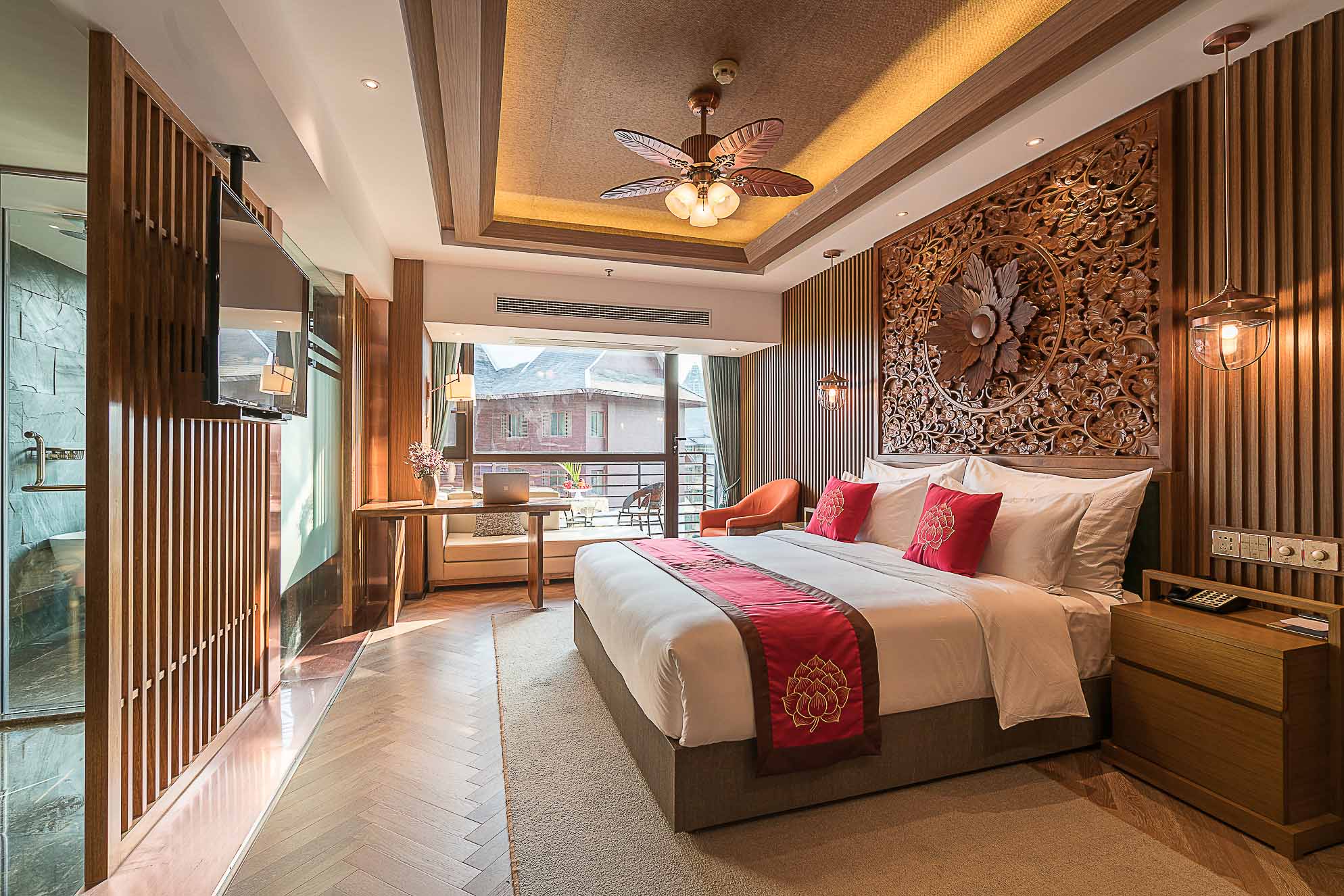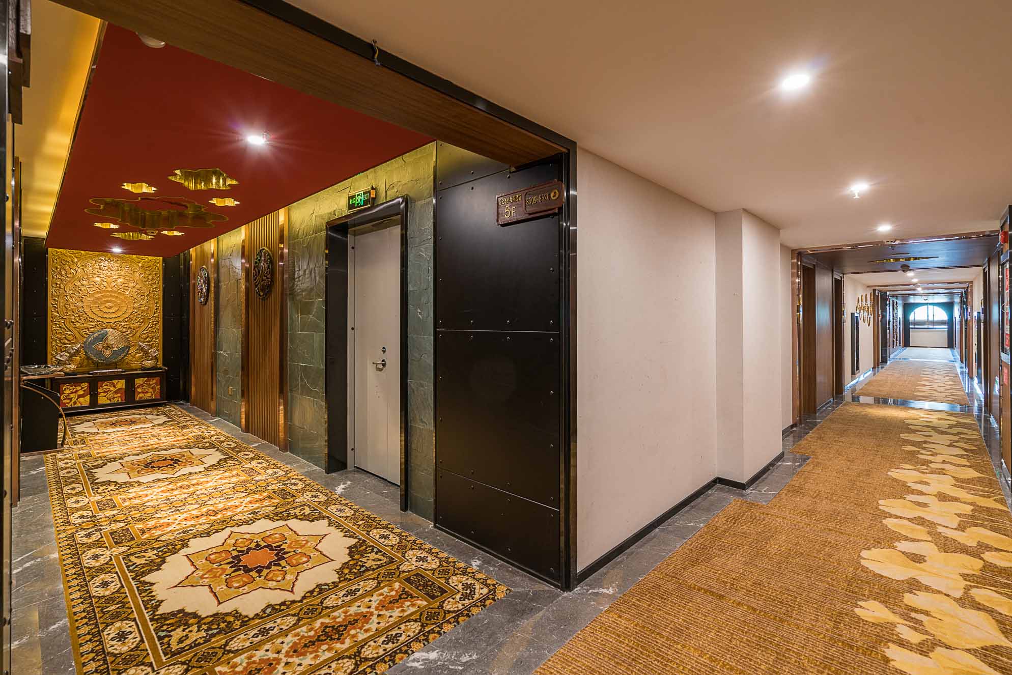在電梯廳的設(shè)計上,紅色的天花、金色的墻體、金色的地毯,和整個酒店的泰式風(fēng)格相輔相成,在邊幾上擺放富有泰式風(fēng)情和佛教感覺的金色擺件,給人一種驚喜的感覺。