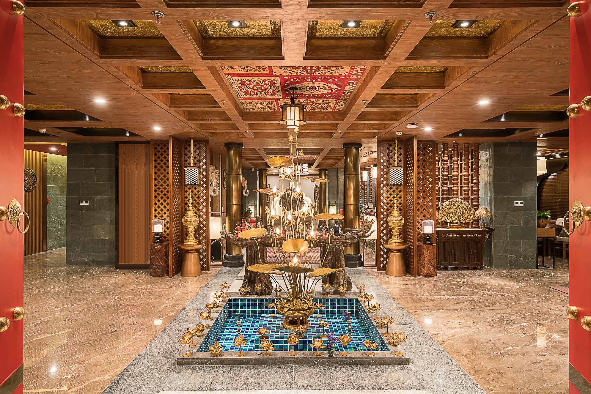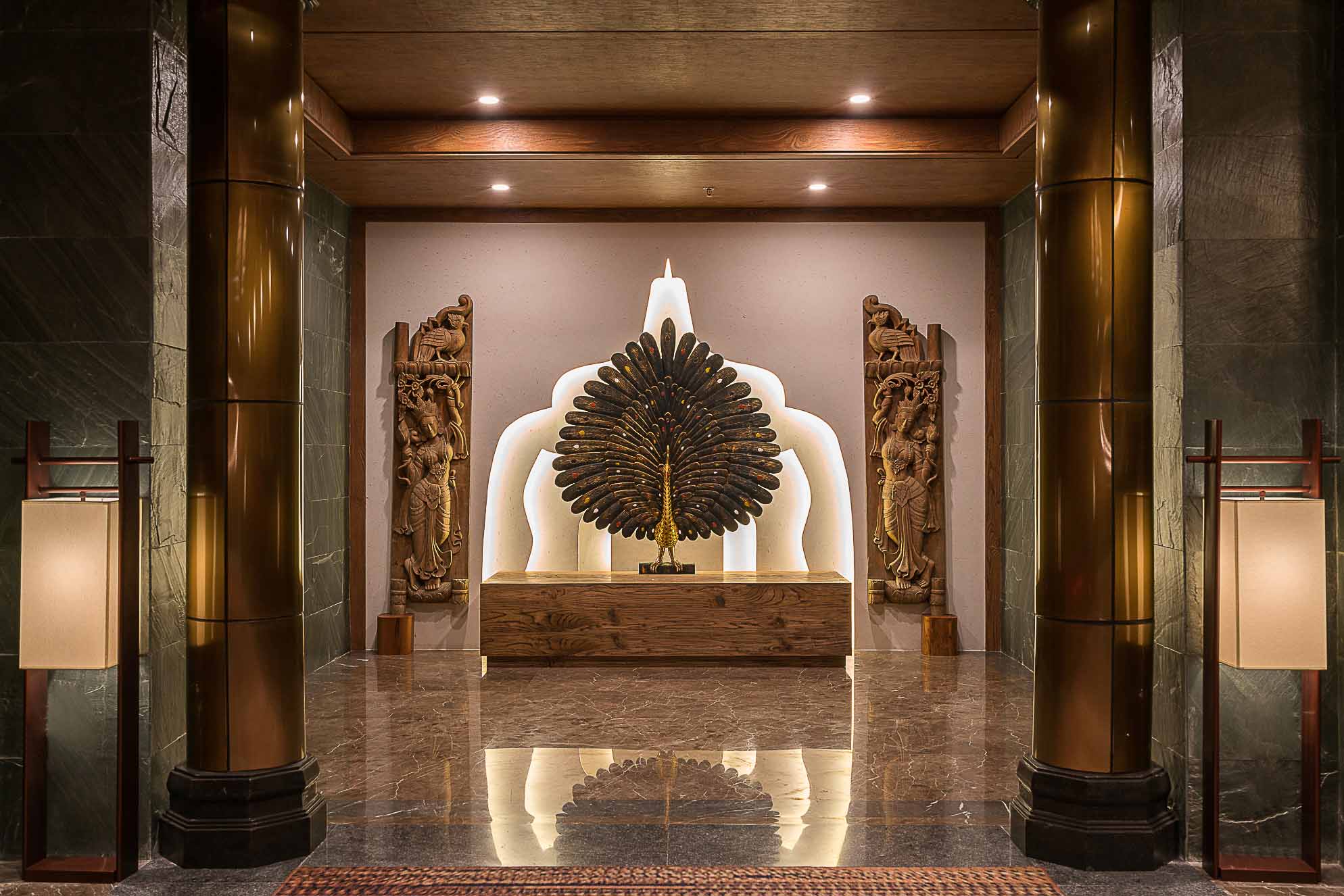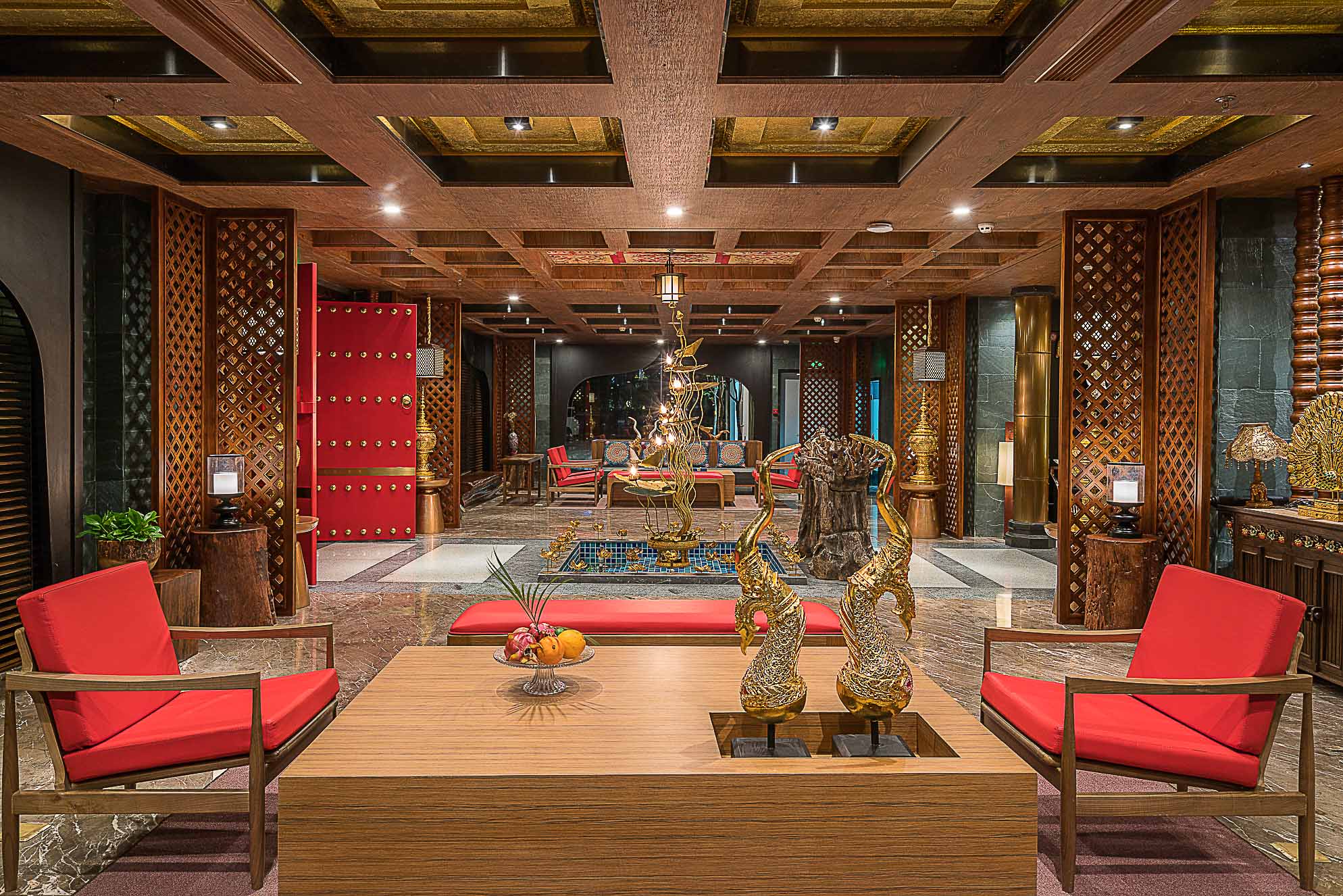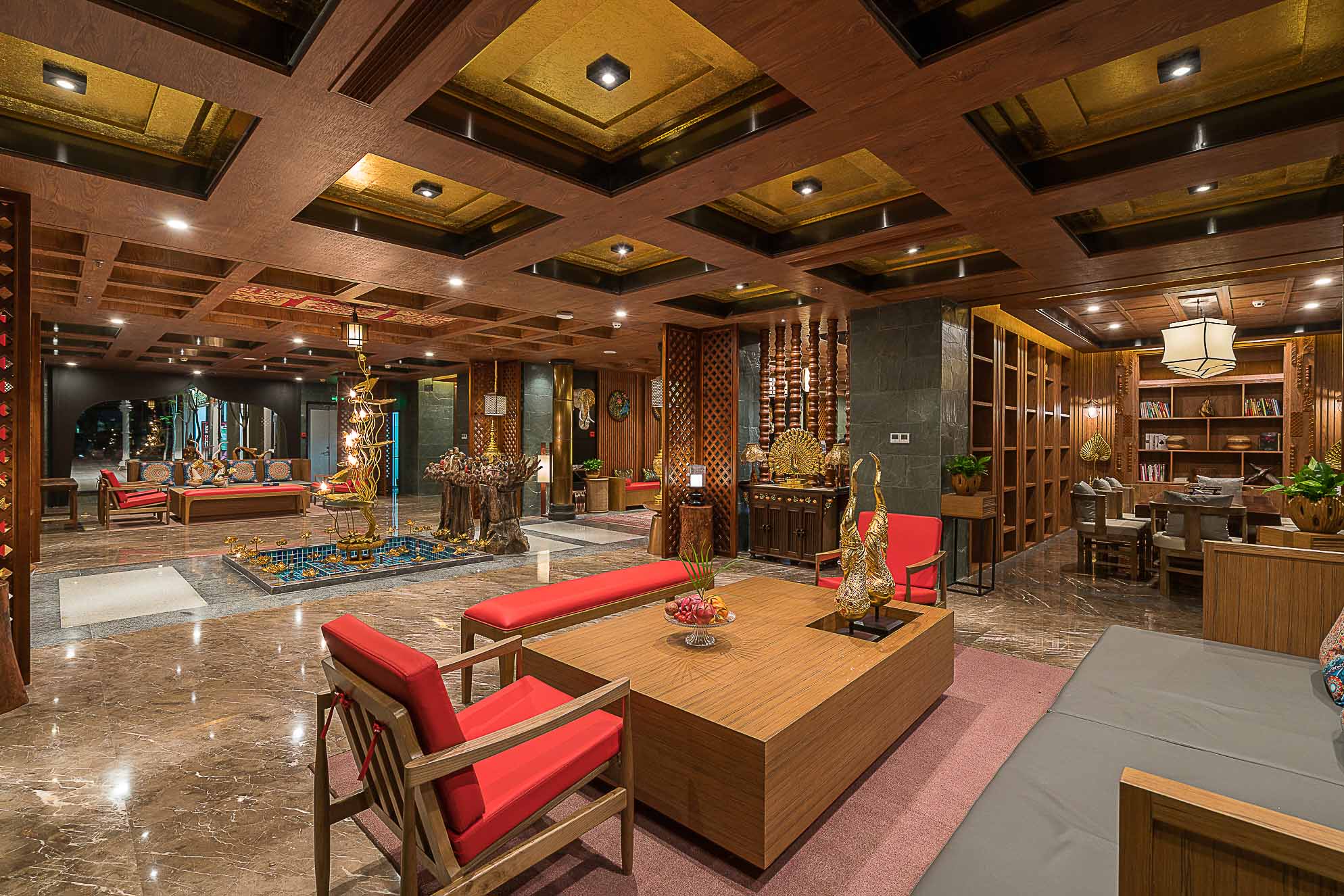在大堂的設(shè)計上,整體以深褐色、金色、暗紅色為主,多選用實木材質(zhì)和金色的金屬,整個空間既穩(wěn)重,又能透出一種奢華之感。加上富有東南亞氣息的蓮花、孔雀及有佛教元素的擺件,使整個大堂也顯示出一種異域的神秘感。
