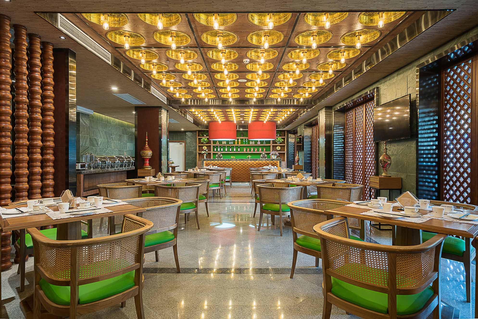 全日制餐廳,座椅選用泰式經(jīng)典藤椅,和同色系的竹桌相結(jié)合,給人一種置身于林間木屋的感覺。天花吸頂燈采用金色燈罩,和大堂色彩搭配一致。餐廳兩側(cè)配有泰式陶瓷藝術(shù)擺件,在細(xì)致的地方體現(xiàn)泰式風(fēng)格。餐具選用了簡潔古樸的白瓷,放在簡單的竹桌上,給人一種回歸自然、感受寧靜的感覺。